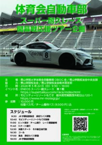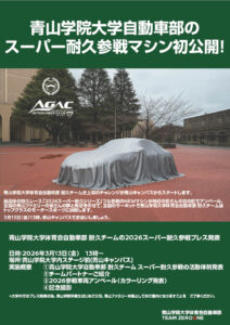 青山学院大学体育会自動車部は1931年に創部されました。そして創部95周年を迎える今年、2026年にトヨタGRスープラGT4エボを使用し、ENEOSスーパー耐久シリーズ ST-Zクラスにフル参戦することを決定いたしました。今回の取り組みは、全国の大学自動車部として初めてスーパー耐久シリーズに参戦する歴史的な挑戦であり、トヨタイムスをはじめ多方面から大きな注目を集めております。
