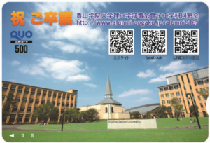 _今日からは、晴れて青山学院の校友です。そして、電気電子工学科同窓会の会員になりました。これまでは、同窓会の存在などは意識されたことがなかったと思います。しかし、今日から生涯に渡り皆さんは同窓会の一員となります。その門出の御祝いに、ささやかですが同窓会からご卒業の記念品(QUOカード)を贈ります。このカードには電気電子工学科同窓会公式サイト、FacebookGroup、公式LINEにアクセス出来るQRコードが書いてありますから、残額が無くなっても捨てないで大事に持っていてください。