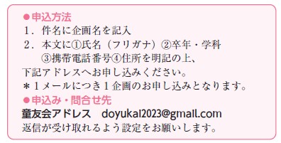 お申込みは①名前②ふりがな③住所④電話番号⑤和暦卒年⑥学科を明記の上