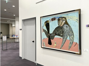 なお相模原キャンパスが開学した際、2002・2003年度の芸術学科卒業制作・修了制作から、デザインを中心に絵画や版画などの作品が各所に設置されました。短大芸術学科の教育の成果を感じることができるキャンパス環境です。(文:趙慶姫)