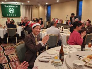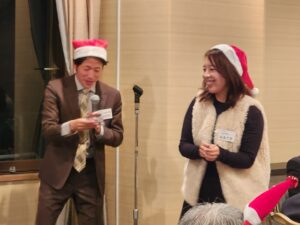 総会後のクリスマス会では、食事とお酒での歓談の中、出席者の学生時代の思い出や近況報告の後、各自が用意したプレゼントが当たるビンゴゲームで大いに盛り上がり、親睦を深めました。