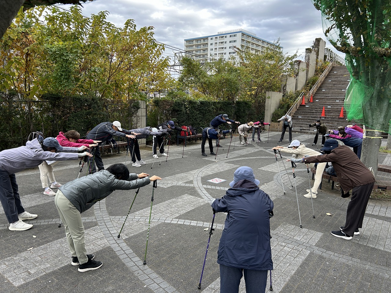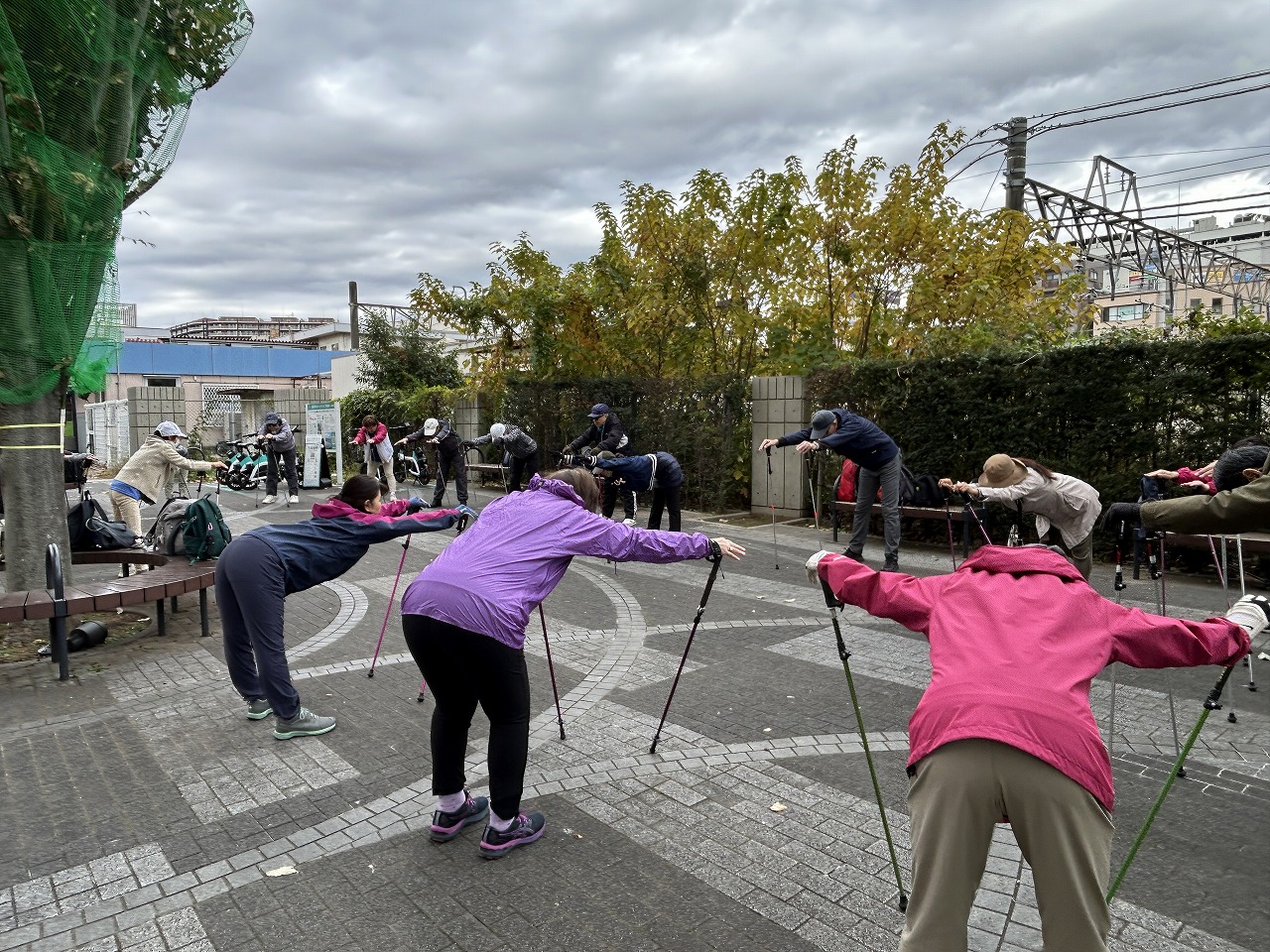 我孫子駅前の広場で スタート前にストレッチで身体をほぐします