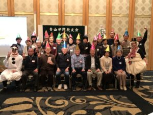 2023年12月9日の夕方5時半からANAクラウンプラザホテル松山にて、恒例のクリスマス忘年会を開催しました。コロナが5類に分類されて初めてのクリスマス忘年会となり、賑やかな会となりました。賛美歌やお祈りに替えて、12月1日に本学で催されたクリスマスツリー点火祭の様子を動画で放映し、この一年の活動を映像を交えて紹介して一年を振り返りました。この一年は通常の校友会活動が本格再開し、5月の四国4県合同ゴルフコンペと懇親会、6月の短期大学の四国支部同窓会、7月の第18回総会・懇親会、9月の坊ちゃんスタジアムで行われた東都大学野球秋季リーグ開幕戦の応援、10月の出雲駅伝の応援と、校友との様々な出会いとご縁を感じながら活動ができたと思います。余興では、これまた恒例の進行役のコスプレ、今年は雪だるまに扮した支部長と宴会女史部長により、携帯の保存写真を使ったゲームによるクリスマスプレゼント争奪戦や支部長からのお年玉抽選会などいつものように楽しく和気あいあいとした時間を過ごすことができました。今年は校友会創設130周年でしたが、来年は青山学院創立150周年そして再来年は愛媛支部創立20周年を迎えます。若手校友会員の増強や活動の充実・活性化など課題もありますが、校友の皆さんと母校を懐かしみ語り合い、お互いが人生の中で校友会という存在が小さくても一つの励みと支えになるような組織作りをこれからも目指していこうと思います。良いお年をお迎えください。 校友会愛媛支部 支部長 妻鳥竜也