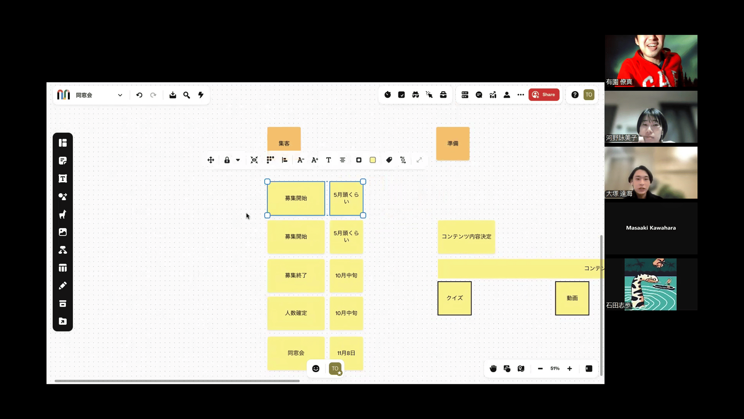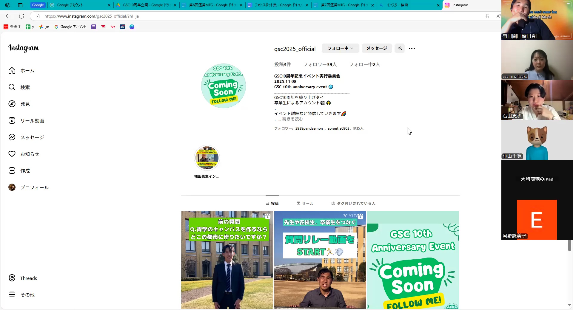 前回の会議後にインタビュー候補にアンケートを送付しました。その回答を基に、インタビュー動画の内容をより詰めていきました。間もなくインタビュー対象者が決まる見通しです。もう1つのトピックは、同窓会インスタグラムでの発信内容です。各担当者が当日のイベントの見所を紹介するなど、さらなる案を出し合っていきました。こちらも近日中に行動に移します。参加者募集開始前としては、次回の会議が最後になります。その助走として、次に話すべき内容もまとめました。