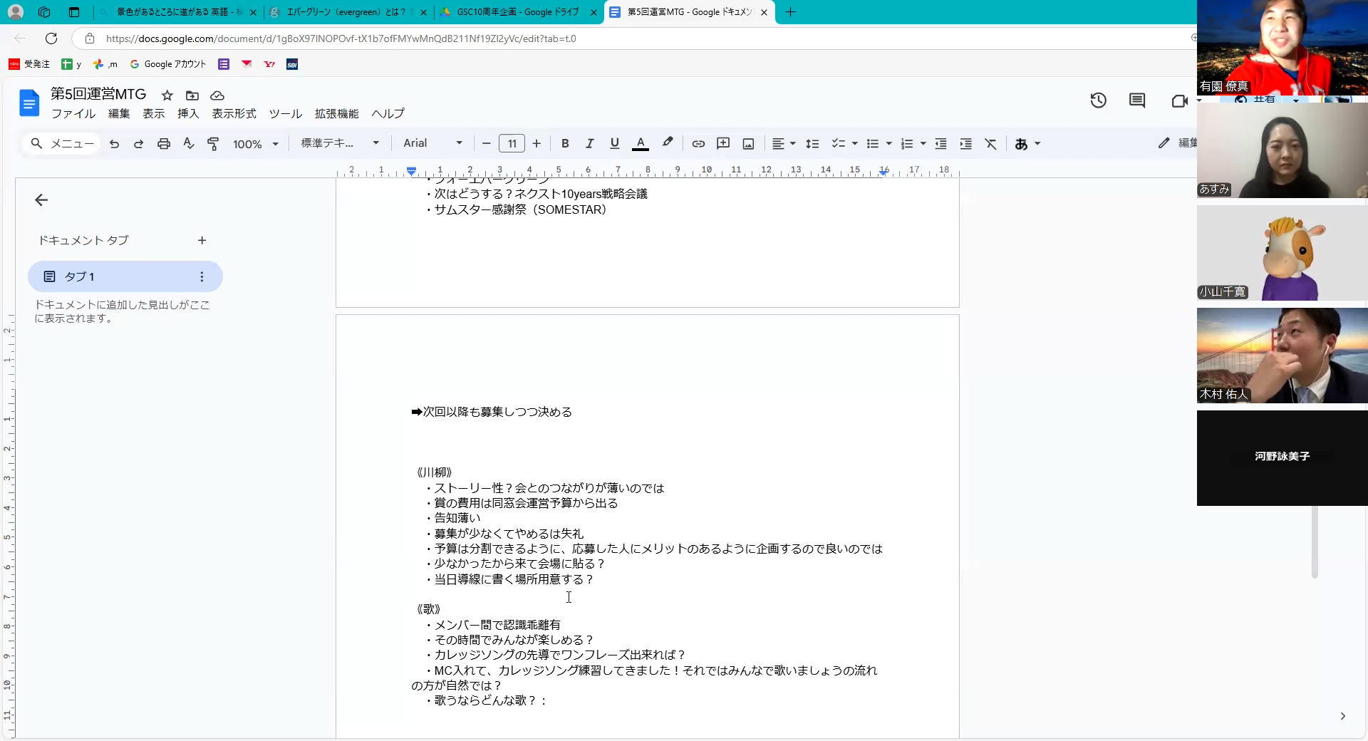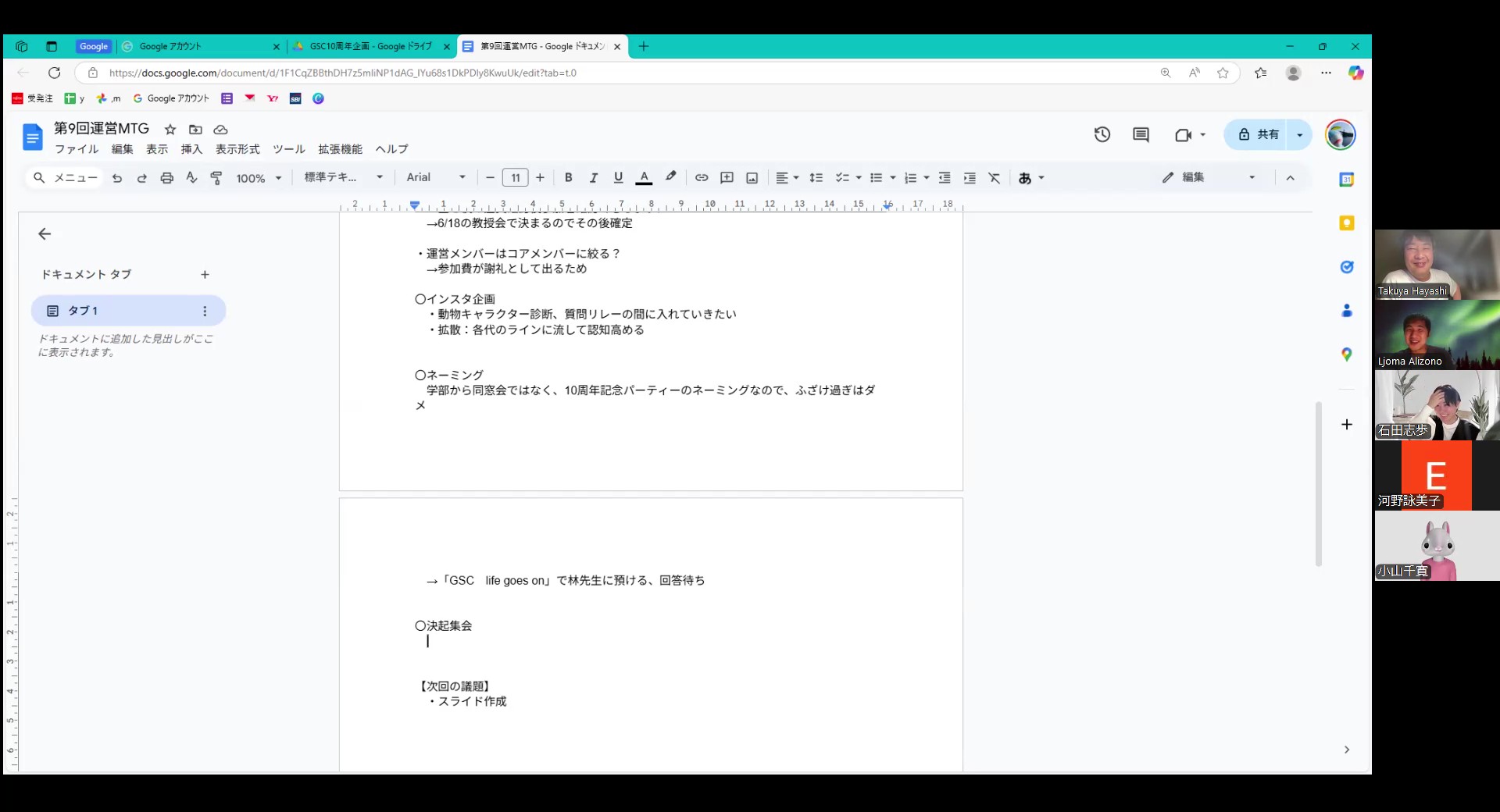 まずは初期段階で作ったマイルストーンと照らし合わせ、現在の達成具合を確認しました。まずまず順調と言えるのではないでしょうか。今後も前倒し前倒しで予定を進めていきたいものです。その後、ひとまずの10周年記念パーティーのサブタイトルが決定!「GSC life goes on」となりました。林先生から「会の締め括りで歌う『Ob-La-Di, Ob-La-Da』の歌詞に出てくるフレーズのため、良い伏線回収になるのでは!」とかなり前向きな言葉をいただきました。当日、どれだけの人が気付くのか楽しみです。さらに、画面を飛び越え、顔と顔を突き合わせて行う決起集会の日程もひとまず着地。「お盆が集まりやすそう」という結論から、8/16(土)夜に開く運びとなりました。それまでにまた、どれだけ準備が進んでいるでしょうか。答えは2か月後、眠らない港町・横浜で明らかになります。