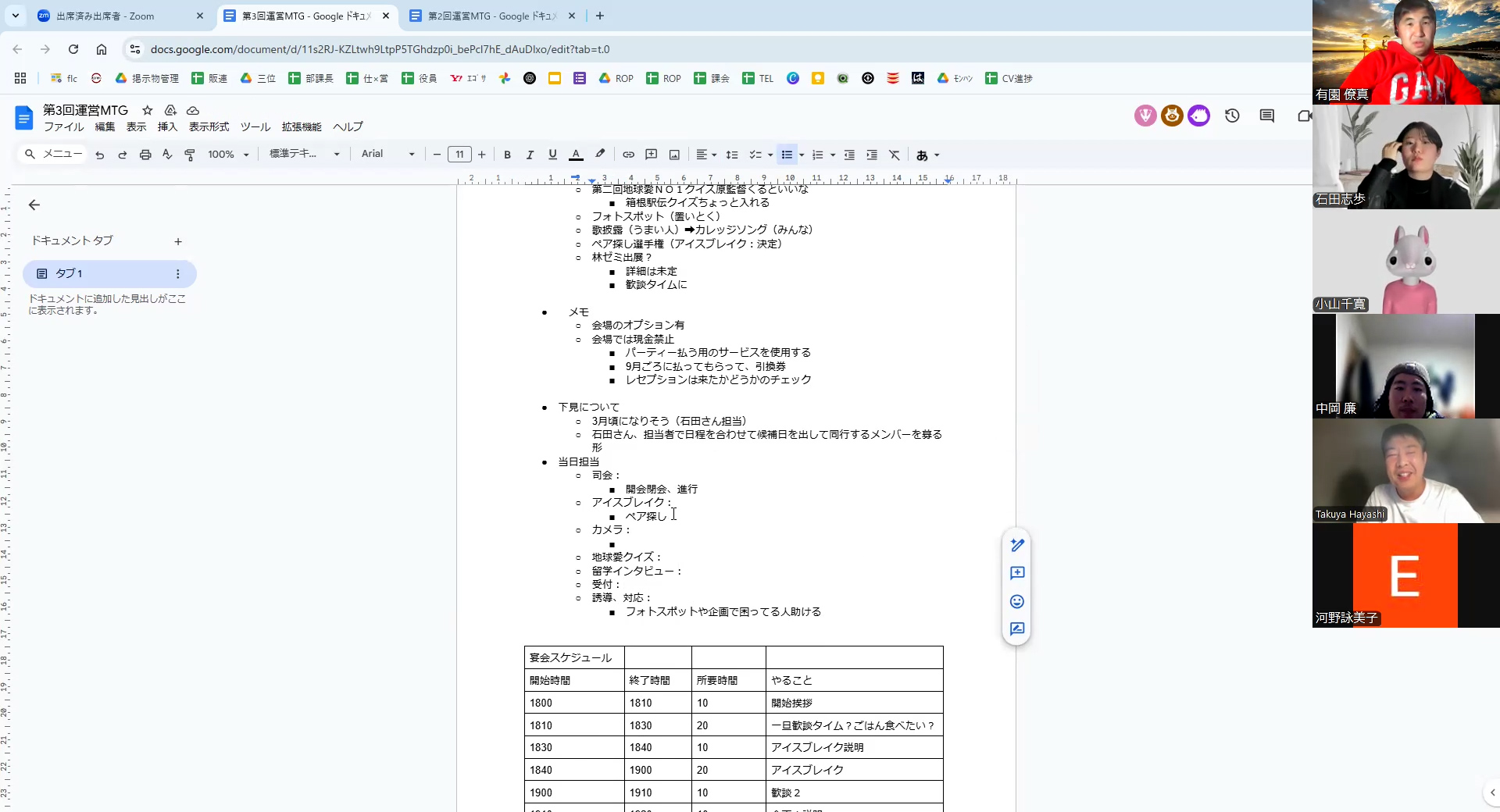 今回は林先生も参加!今までで最も多くの人数が集まり、非常に捗る会議となりました。それぞれの役割分担、仮ではありますが当日のタイムスケジュールも設定でき、一気に前へ進んだ感があります。今後も早め早めを心掛け、常に前倒しで事を進めていきたいです。