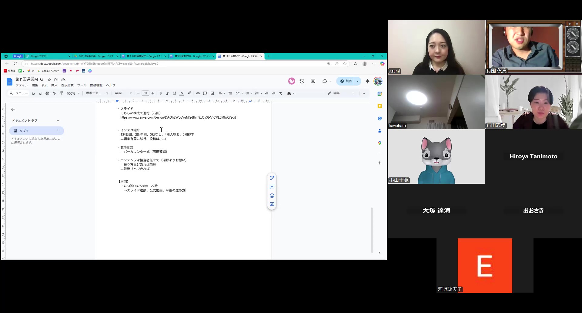 翌日からの募集に向け、近頃は水曜固定ではなく柔軟性を持たせているとはいえ、珍しく火曜に開催しました。メイントピックはやはり、10周年記念パーティーの参加者募集。文言を最終決定しました。1人でも多くの人に参加してもらうために、一言一句精査していきました。また、公式インスタグラムでの投稿コンテンツも擦り合わせ、より“実戦”の意識を高めていきました。さらには、インタビュー動画の制作も進行中です。対象者が決まったなか、こちらも具体的に意見を交換し、前へ前へと持っていきました。