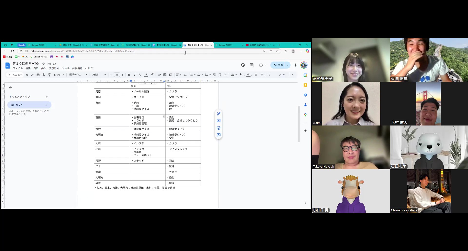 暑さが非常に厳しくなってきたなかでの会議開催です。6月でこの猛暑…7月8月は一体どうなってしまうのでしょうか。10周年記念行事が行われる11月は快適な気候であることを祈るばかりです。さて、中国帰りで万里の登城の疲労を抱えた出席者もいたこの日は、各々の事前・当日の担当を改めて確認しました。過度な割り振りがないよう再調整です。ここに来て、新たな仕事として午前の部で流す映像制作も、我々で受け持つ可能性が出てきました。今後の進展に大注目です!
