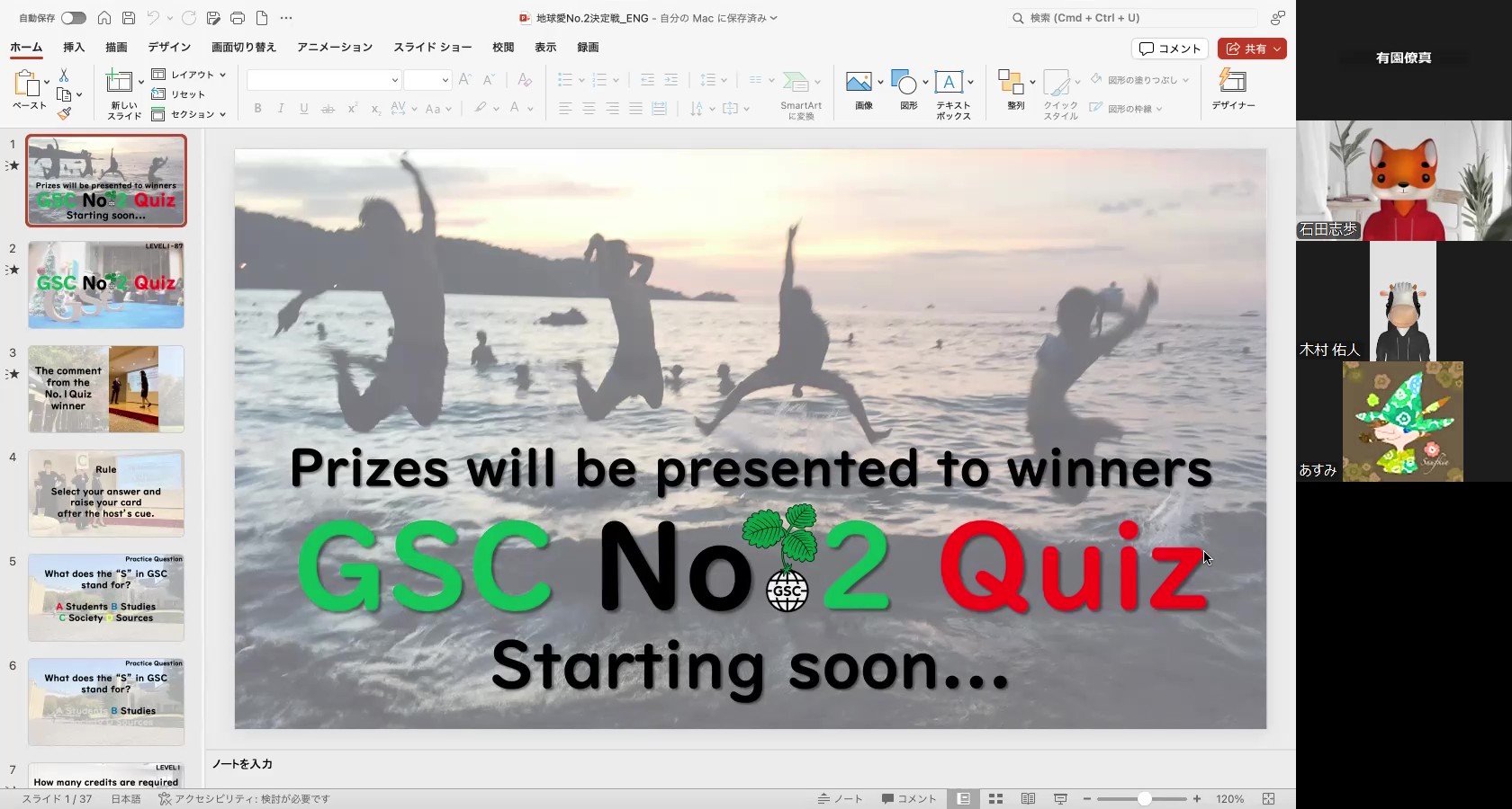 大学・学部・キャンパスに関するクイズを出題し、「誰が最も地球を愛しているのか」論争に終止符を打ちました。まず5問を団体戦で、残る3問を勝ち抜いたチームのメンバーが個人戦として臨むフォーマットで実施。大白熱で地球史に残る激戦が繰り広げられました。