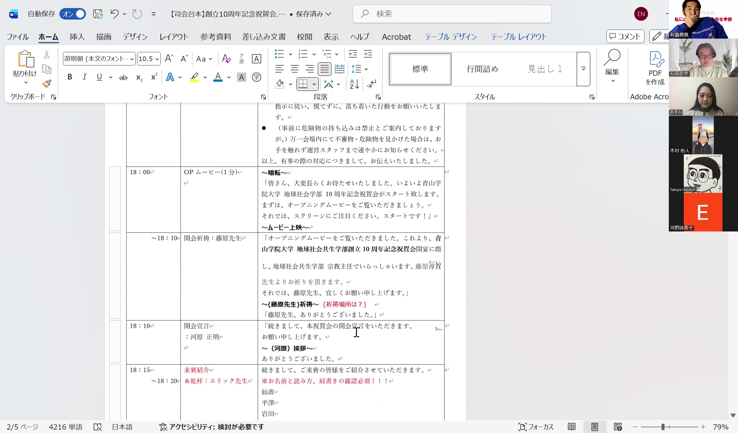 みっちりと時間をかけ、挨拶や各種イベントを入れ込んだプログラムをじっくりと詰めました。以前にも同じようなことを書きましたが、やはり当日は想定外の出来事が次々に起こることが想定されるなか、どれだけ事前に想定しておくかが鍵です。時間配分にも余裕を持たせ、まずは心の余裕を作らなければなりません。また、イベント自体の詳細も精査しました。まだまだ改善できる部分はあります。