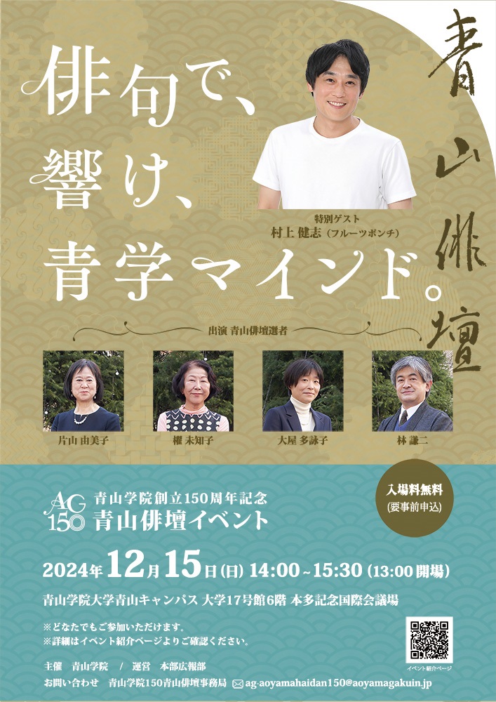 この度、青山学院創立150周年を記念して、大学経済学部の卒業生で、お笑い芸人の村上健志さん(フルーツポンチ)をお迎えして、下記の日程で俳句にまつわるイベントを開催いたします。どなたでもご参加いただけるイベントですので、みなさまふるってご応募ください。 日時:12月15日(日)14時~15時30分(13時開場) 場所:大学17号館6階 本多記念国際会議場 募集定員:500名(応募者多数の場合、抽選により決定) 応募期間:11月6日(水)10時 ~ 11月30日(土)まで