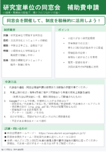 先日、HPにてお知らせいたしました研究室単位の同窓会における補助費の申請制度が完成しましたのでお知らせいたします。