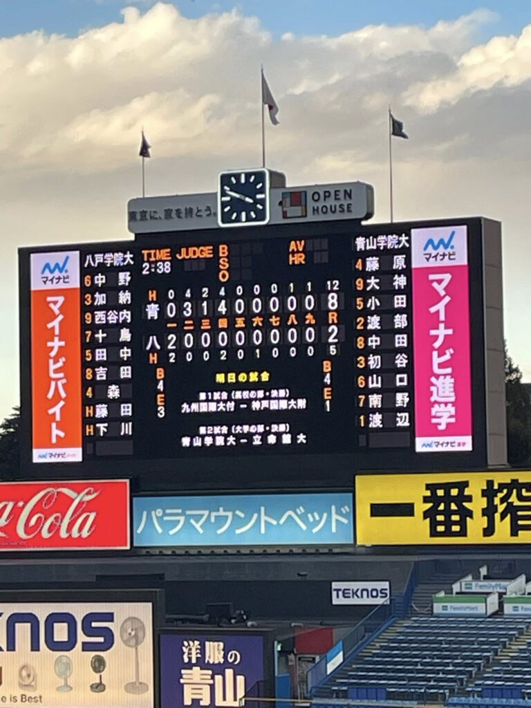 この日は、前の試合で、優勝候補筆頭六大学リーグを10勝無敗の明治大学が、立命館大学に延長激闘の末2対7で敗れるという波乱もあり、全国の野球連盟を勝ち上がった強者の実力を見せつけられました。