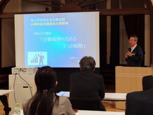 今回の記念講演会では、大学院国際マネジメント研究科青山ビジネススクール(ABS)で長年にわたり、MBA授業の一環を支部の皆さんにわかりやすく、ご講義いただきました。「企業価値とは何か?」そんな問いを出発点に企業経営の本質に迫り、そして、企業価値を高めるための戦略を、3つの視点から分かりやすく解説いただきました。MBAのエッセンスを凝縮した実践的な入門講座です。また今後の展望について意見が交わされ、参加者から多くの共感と意見が寄せられました。