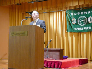 次に来賓としてご出席の青山学院校友会会長の紀 正尚氏より、校友会の活動方針について「母校への貢献」「デジタル化推進」「広報活動の充実」などの話を。続いて、学校法人青山学院総局長の古谷一弘氏より、資料に基づき、青山学院の近況について、「ミュージアム」オープン、「統計データサイエンス学環」の設置構想、「陸上競技部」「硬式野球部」の活躍などについての話を、次に、青山学院大学 教育人間科学教授の内田洋子氏より、浜松出身の自己紹介と青山学院大学独特のアドバイザーグループの話など、学院と校友会の現況を聞くことができた。