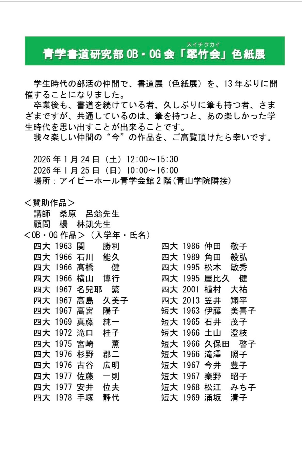 青学書道研究部OB・OG会「翆竹会」では、この度2013年より13年ぶりに、以下の通り「色紙展」を開催することにいたします。